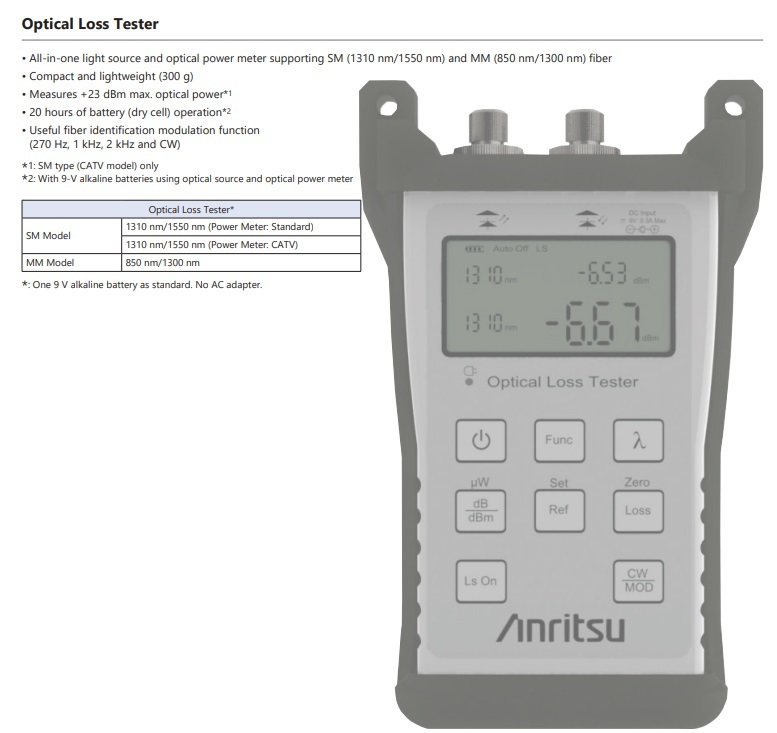 ● 光功率计校准波长:850,1300,1310,1490,1550,1625 nm · 光源支持多模(850/1300nm) 和单模(1310/1550nm)